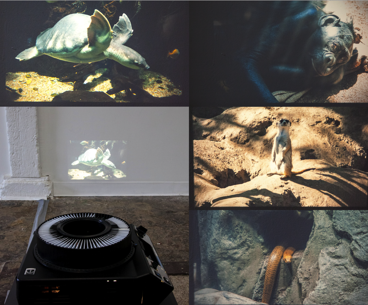 The Eyes That See You, is a slide projection on an automated loop that shows pictures of animals at display in two different zoos in California. Recording the moment in which the animals looked straight at the camera, the piece memorializes a moment of acknowlegdment. Projected in the space, the eyes of the animals “find” the gaze of the viewer. That moment of seeing is one of mutual recognition: we see their captivity, but they also reflect ours.